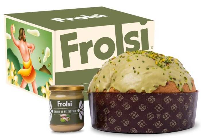 Panettone Frolsi al pistacchio con crema spalmabile al pistacchio.
