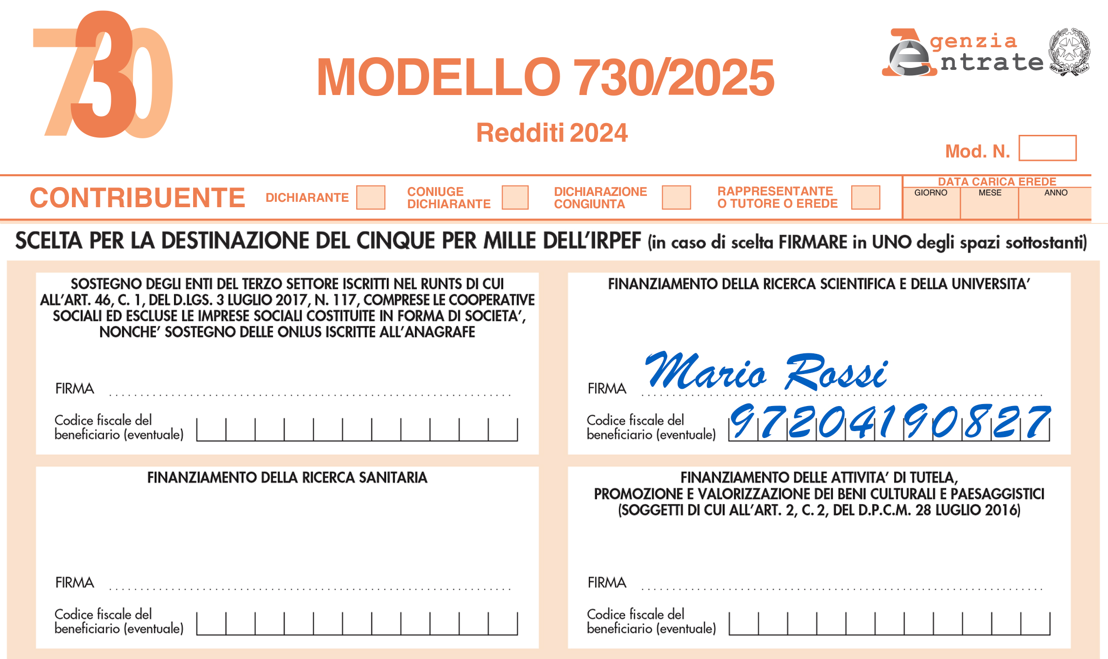 Al momento della tua dichiarazione dei redditi, nel modello specifico 730, CUD o Unico Persone Fisiche, troverai un riquadro denominato “FINANZIAMENTO DELLA RICERCA SCIENTIFICA E DELLA UNIVERSITA’”, li inserisci il codice fiscale della nostra Fondazione 972 041 90827 e apponi la TUA FIRMA nella riga specifica. come nell’esempio che segue.